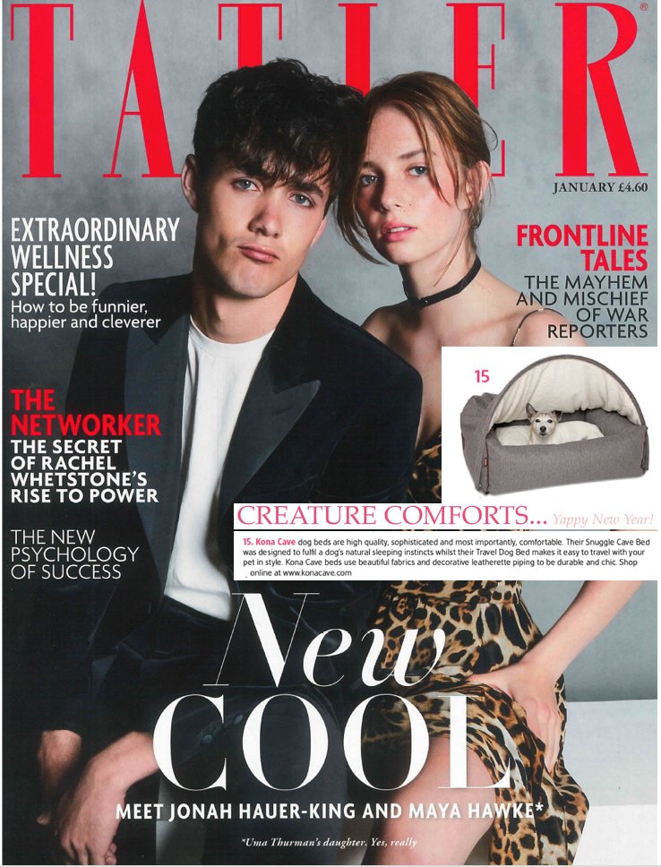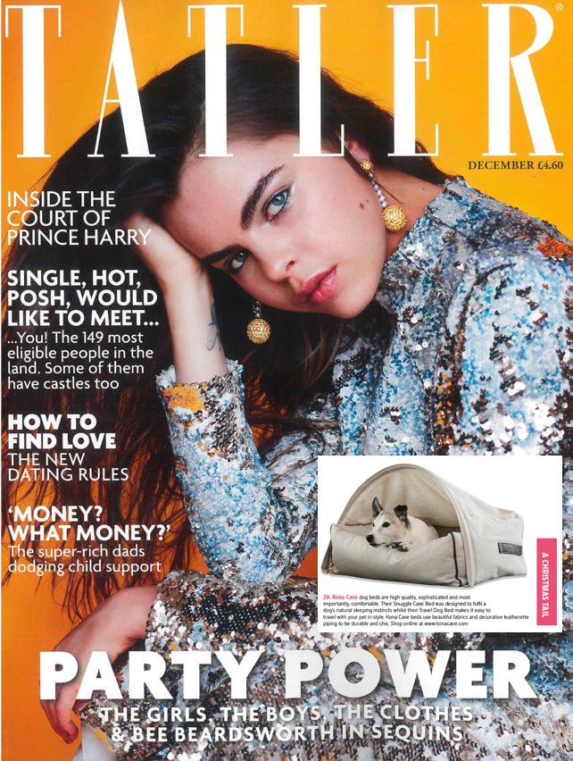 KONA CAVE's® exclusive Snuggle Cave Dog Bed is highlighted by TATLER magazine in the December Christmas Gift Giving edition called A Christmas Tail.