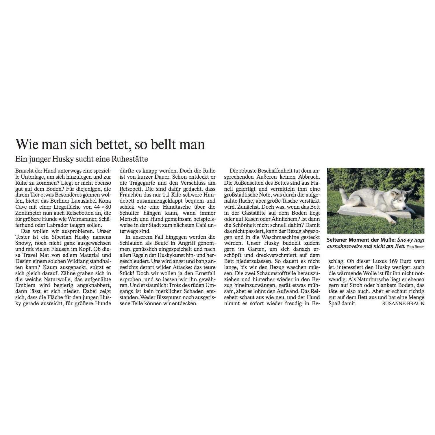 The Technology and Motor section of the German Newspaper, Frankfurter Allgmeine Zeitung, gives our KONA CAVE® Travel Dog Bed a thorough workout and testing.