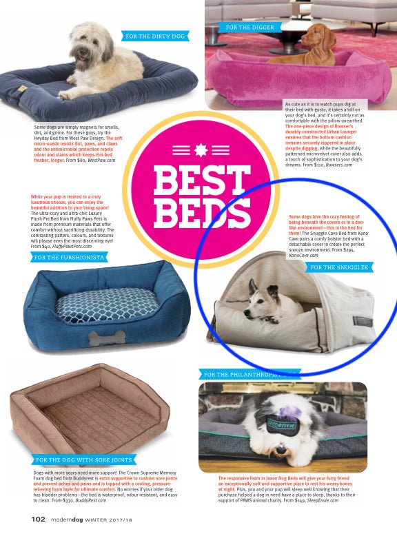 KONA CAVE'S exclusive Snuggle Cave Dog Bed was voted the BEST BED for Snuggling Dogs in the Winter Edition of Modern Dog Magazine.