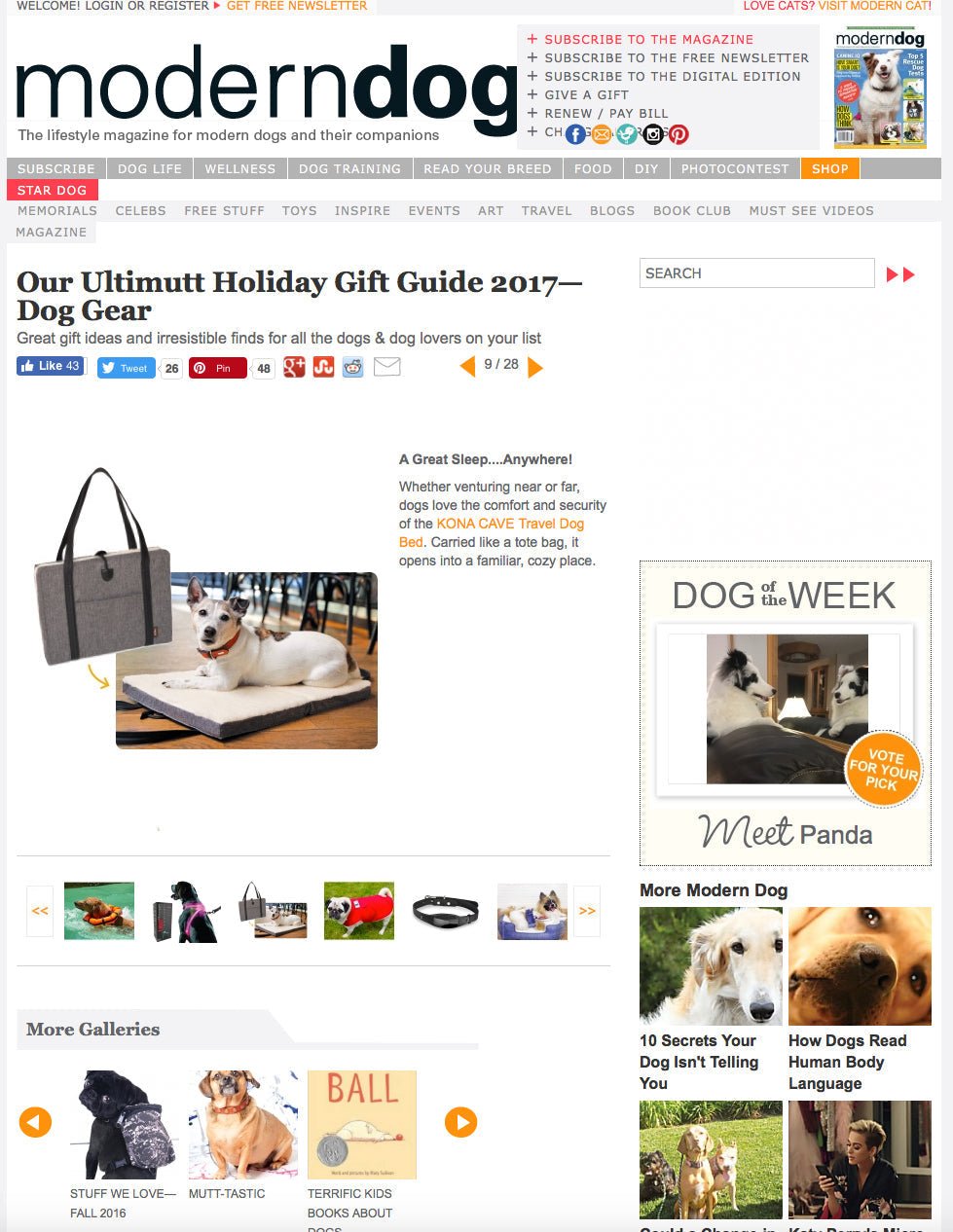 KONA CAVE's Travel Dog Bed was highlighted in Modern Dog's online magazine a best dog gift idea.
