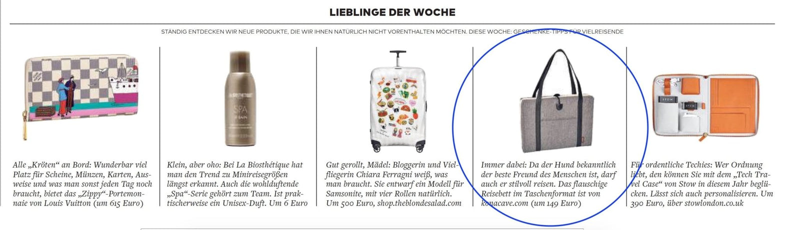 Our elegant and brilliant KONA CAVE® Travel Mat/Dog Bed, in Grey Herringbone, was featured as a Favorite Thing of the Week in WELT AM SONNTAG.